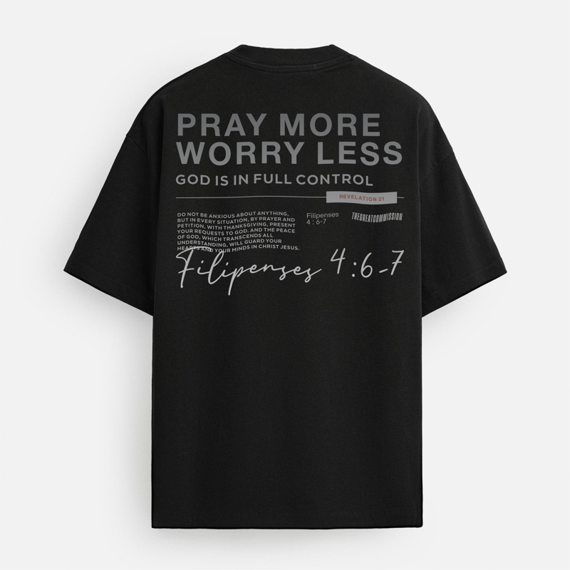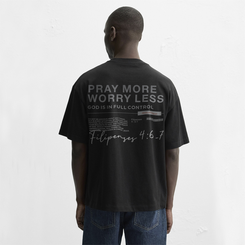 ✝️ Camiseta Oversized – PRAY MORE, WORRY LESS Mais do que um conselho, uma atitude de fé. A camiseta “PRAY MORE, WORRY LESS” ecoa Filipenses 4:6-7 com design moderno e uma tipografia que inspira confiança e entrega. Uma composição que mistura o urbano ao eterno: PRAY MORE, WORRY LESS. GOD IS IN FULL CONTROL. (Filipenses 4:6-7 – “Não andem ansiosos por coisa alguma, mas em tudo, pela oração e súplicas, e com ação de graças, apresentem seus pedidos a Deus. E a paz de Deus, que excede todo o entendimento, guardará os seus corações e as suas mentes em Cristo Jesus.”) Essa peça é um lembrete visual e espiritual: 📌 Ore mais. Confie mais. Se preocupe menos. 📌 Deus está no controle. VISTA A PAZ. VISTA A CONFIANÇA. Seja o reflexo de quem crê que tudo coopera para o bem daqueles que amam a Deus. Modelagem oversized premium em Heavy Cotton com acabamento refinado.