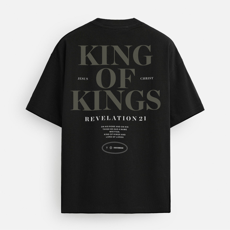 ✝️ Camiseta Oversized – KING OF KINGS Mais do que um título, uma proclamação celestial. A camiseta “KING OF KINGS” carrega a força de Apocalipse 19:16 com uma presença visual imponente. Sua tipografia impactante e composição minimalista expressam reverência, autoridade e glória: KING OF KINGS. LORD OF LORDS. (Revelation 19:16 – “On his robe and on his thigh he has this name written: King of kings and Lord of lords.”) Essa peça não é apenas roupa. É uma armadura. Um lembrete vivo de quem reina sobre tudo e todos. VISTA A MAJESTADE. ANUNCIE O REINO. Seja o reflexo Daquele que está acima de todo nome. Modelagem oversized premium em Heavy Cotton com acabamento refinado.